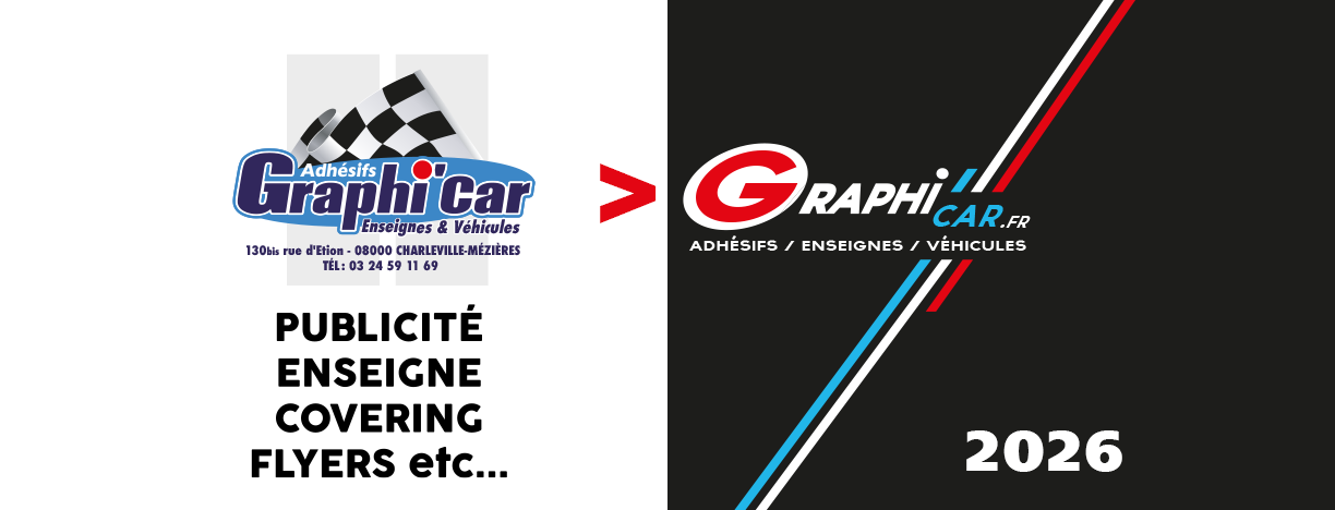 Design graphique. Evolution de la charte graphique de l’entreprise ardennaise spécialiste en création et pose d’adhésifs sur tout type de support (Enseignes ; véhicules ; …) : Graphi’Car.